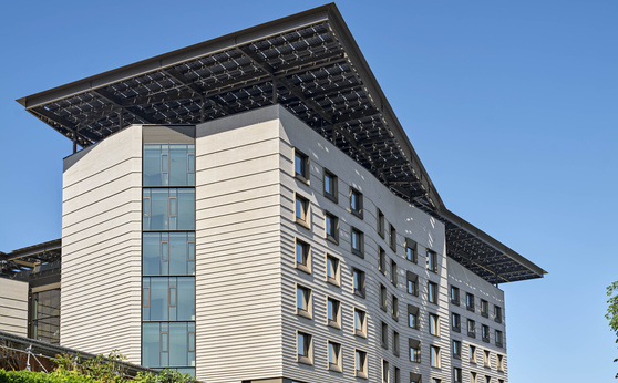 The 154 bed, 250,000 GSF building is required to comply with ASHRAE 170, making it similar to an inpatient hospital bed tower. The building also includes a central kitchen. Even with this challenging high-energy program, the building is deigned to achieve Net Zero Energy. The building relies on a super-insulated façade with tripe glazed operable windows, a closed loop geo-exchange system, 90,000cfm of dual enthalpy wheel water-source heat pump air handlers, and water source VRF fan coil units. A 0.5 MW array floats above the roof and off-site renewable energy will allow the building to achieve Net Zero Energy.