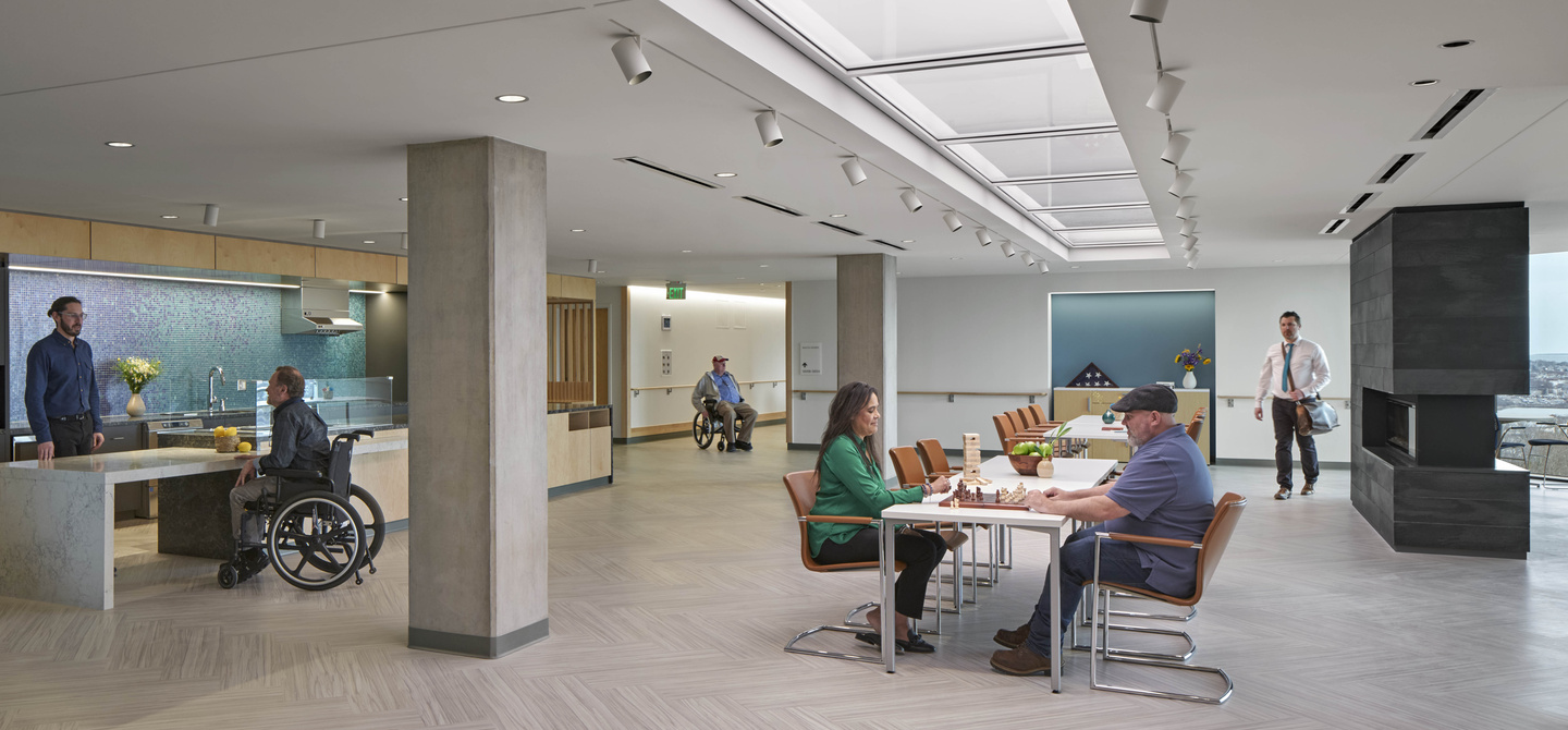 The Soldiers' Home in Chelsea, Massachusetts replaces the previous facility that housed residents in large open wards with a new, more dignified and modern residential care environment for veterans. Sadly, in the old facility, many of the residents died from COVID, when the pandemic spread rapidly through the open wards. In the new facility, individual resident rooms offer the veterans privacy and protection for the first time. Each half of the building is configured as a "neighborhood," where the resident rooms open onto common living, dining and kitchen areas. This creates a home-like environment for social connection and support. The central connector between each wing houses the larger shared program areas, including the main lounge, event spaces, education spaces, and a physical therapy facility. Overall, the new facility is a dramatic transformation of the quality of life and the health and safety of the residents.